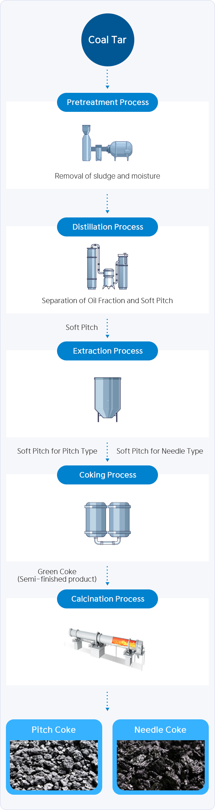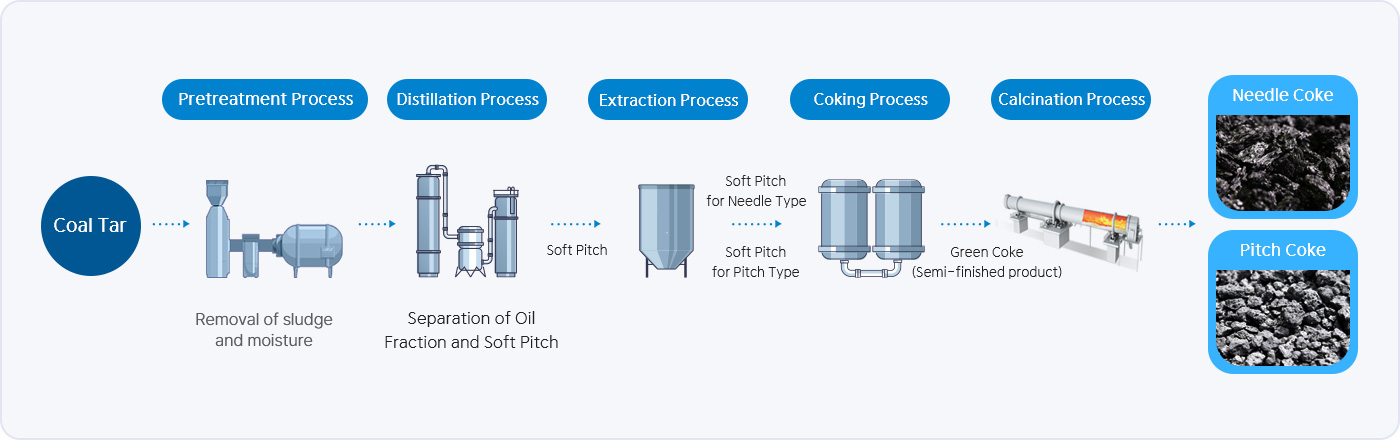 Soft Pitch undergoes a Polycondensation reaction to generate semi-finished Green Coke for Needle and pitch applications.